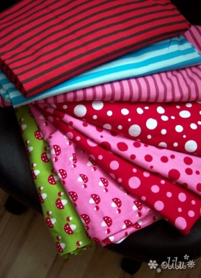 Jedenfalls hab ich wieder etwas Platz im Regal und konnte mir endlich mal neue Stoffe gönnen *g* Im Warenkorb lagen sie schon lange, heute sind sie hier eingetrudelt: Gabys Pilzjerseys und vor allem die tollen Punktestoffe (erhältlich hier)! Dazu noch ein paar Sanetta-Kombijerseys. Hach, schön. *streichel*