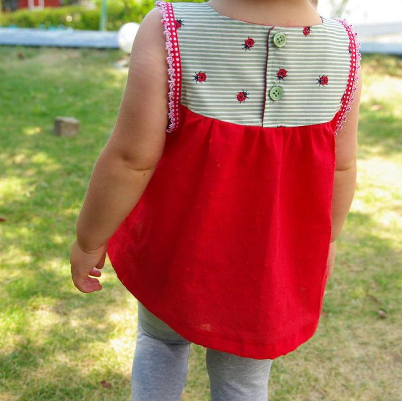 Ich tendiere ja immer dazu, die Passe einfarbig zu lassen und den Rest aus gemustertem Stoff zu nähen. Hier ist das perfekte Beispiel dafür, dass es umgekehrt mindestens genauso toll aussieht! Dazu noch die echten Knopflöcher und das Schrägband mit der hübschen Häkelborte an den Armausschnitten – fertig ist ein echtes Lieblingsteil.